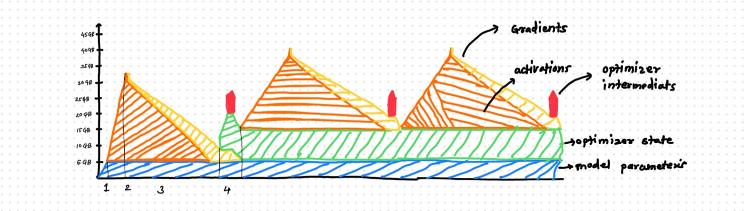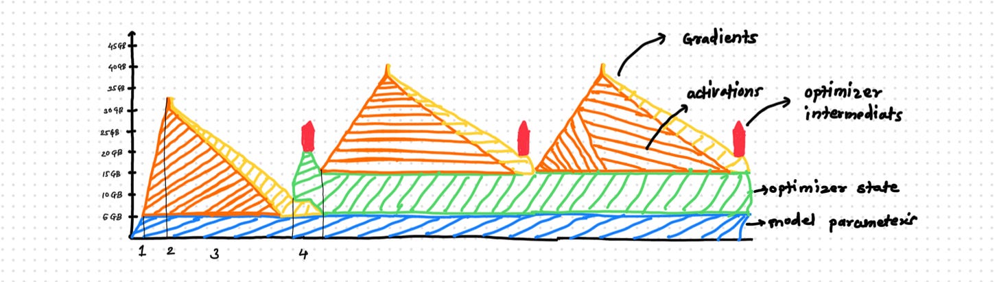 Optimizer States: Optimizers like Adam maintain additional states such as momentum and variance for gradient updates, which can significantly increase memory requirements.